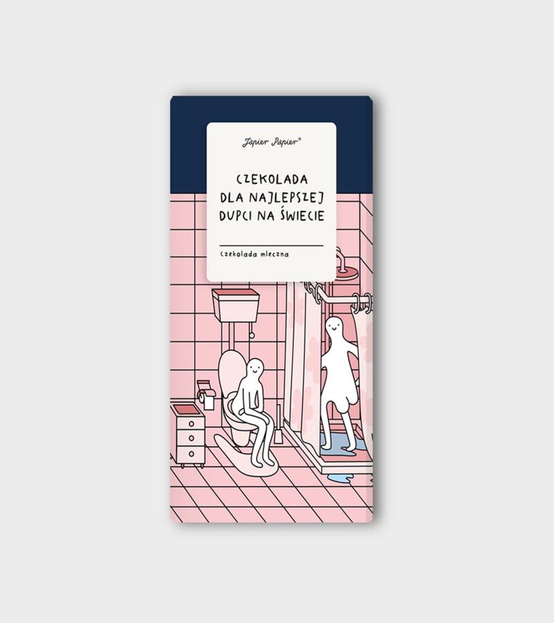 Czekolada mleczna dla najlepszej Dupci na świecie. Słodki hołd dla wszystkich cudownych, niepodrabialnych Dupci tego świata. Zapakowana w papierowy kartonik z japierpapierniczą ilustracją. Po rozpakowaniu skrywa mały bonus – karnet z życzeniami: