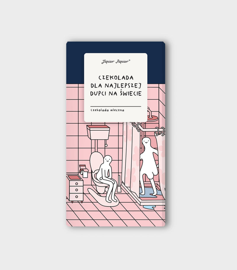 Czekolada mleczna dla najlepszej Dupci na świecie. Słodki hołd dla wszystkich cudownych, niepodrabialnych Dupci tego świata. Zapakowana w papierowy kartonik z japierpapierniczą ilustracją. Po rozpakowaniu skrywa mały bonus – karnet z życzeniami: