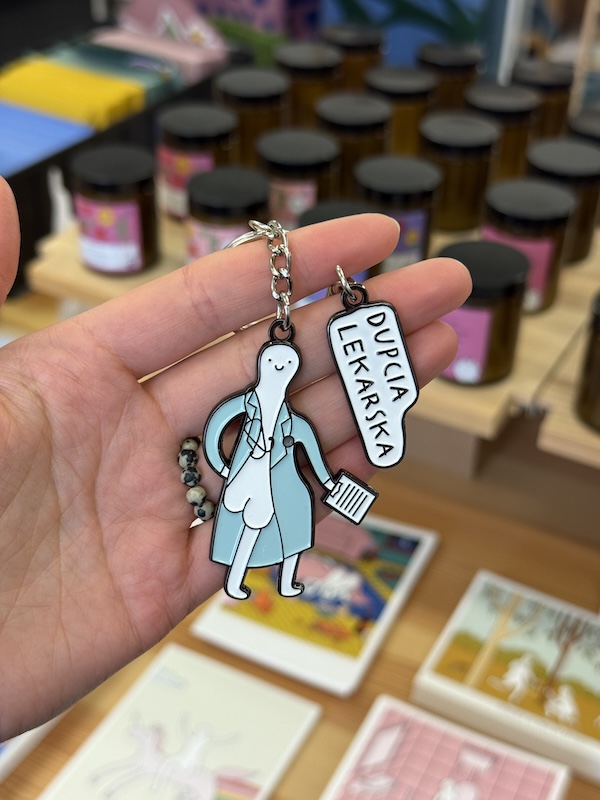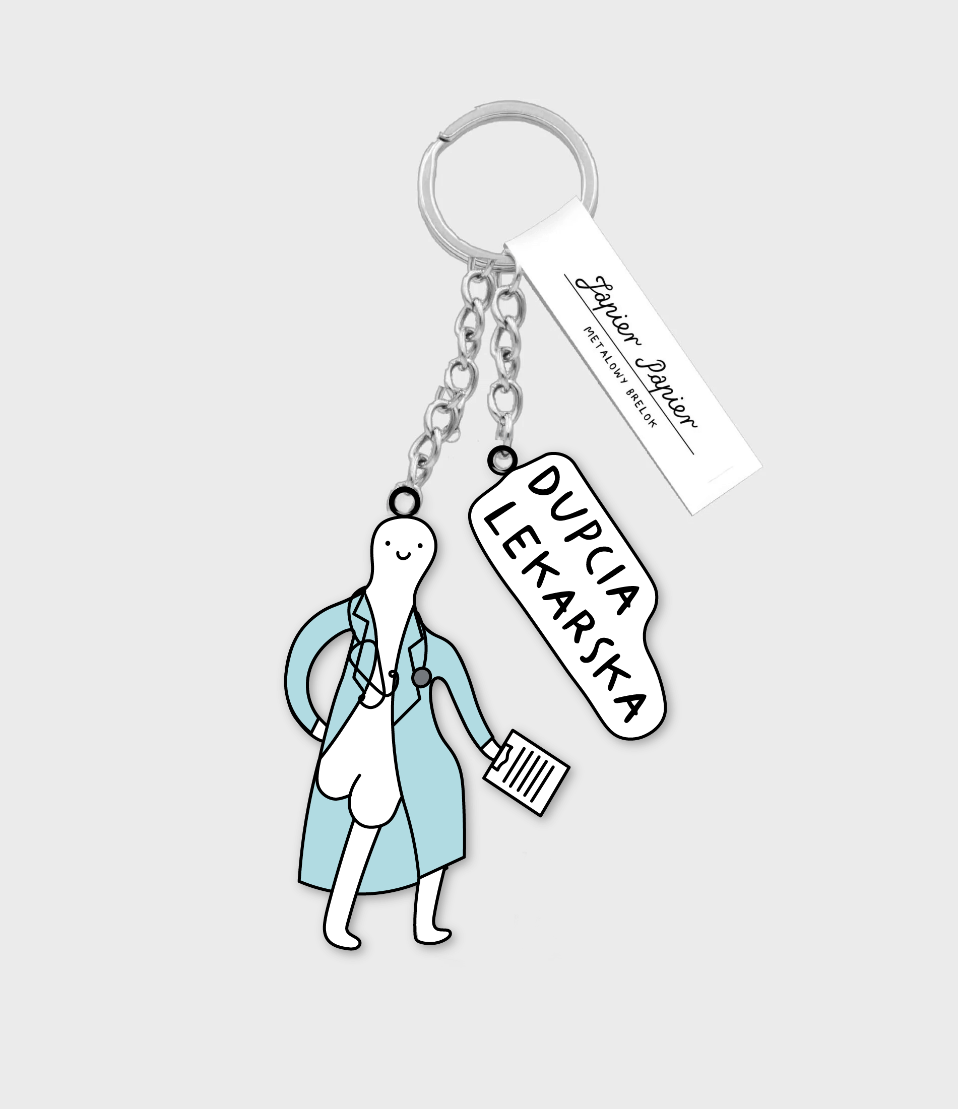 Metalowy brelok z emaliowanym napisem Dupcia lekarska.