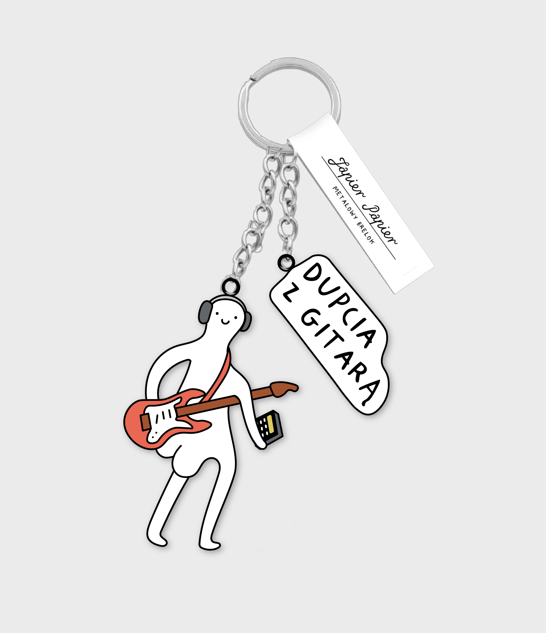 Metalowy brelok z emaliowanym napisem Dupcia z gitarą.
