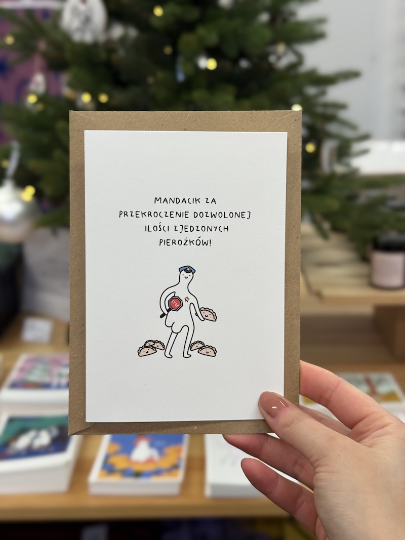kartka świąteczna – Mandacik za przekroczenie ilości zjedzonych pierożków!