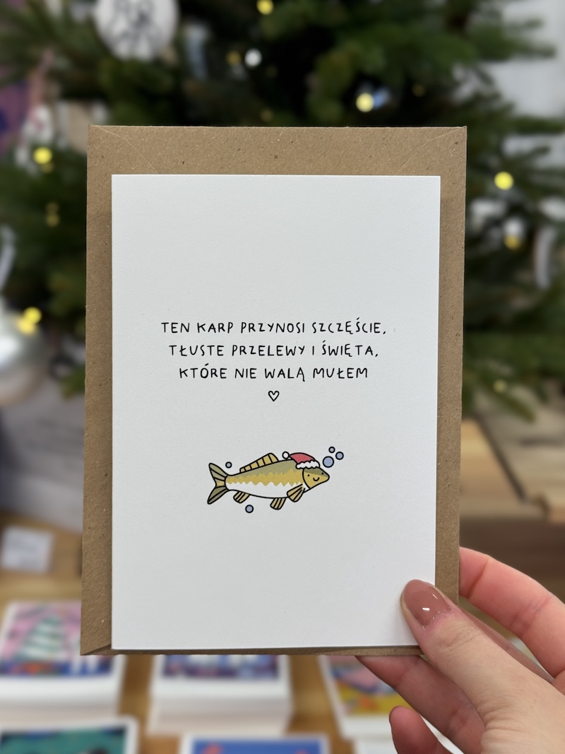 kartka świąteczna – Ten karp przynosi szczęście, tłuste przelewy i święta, które nie walą mułem