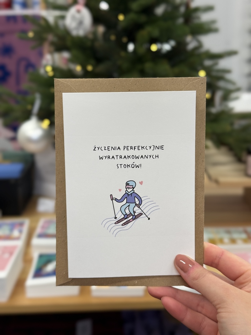 kartka świąteczna – Życzenia perfekcyjnie wyratrakowanych stoków!