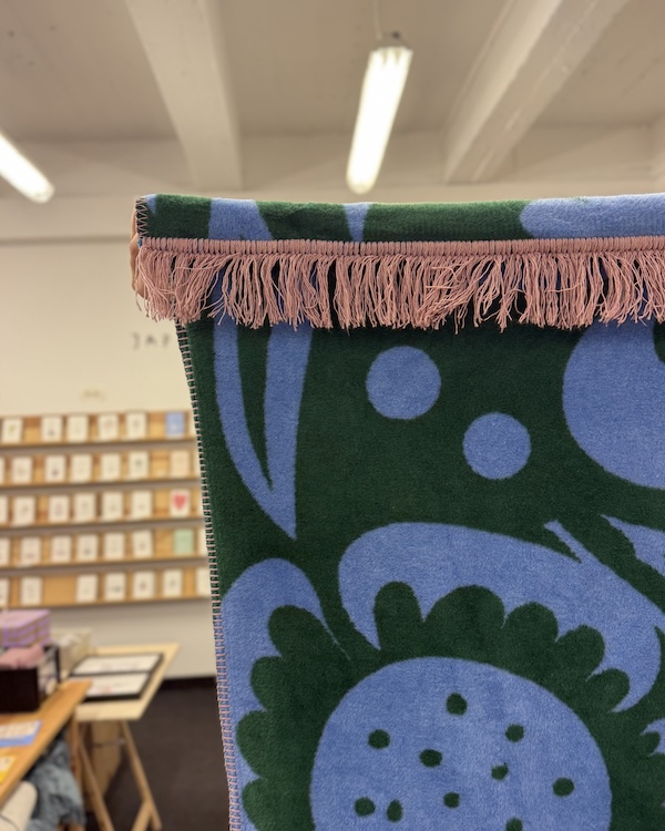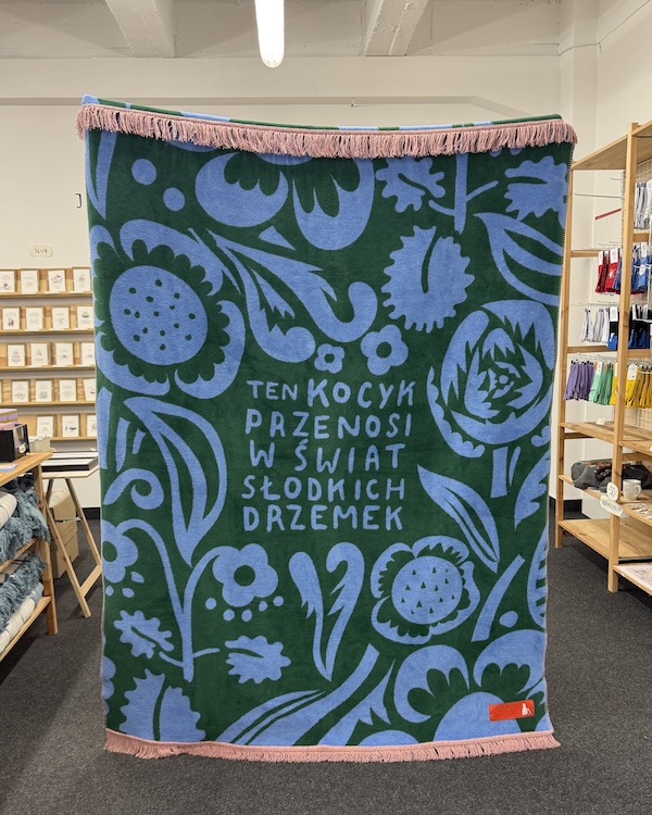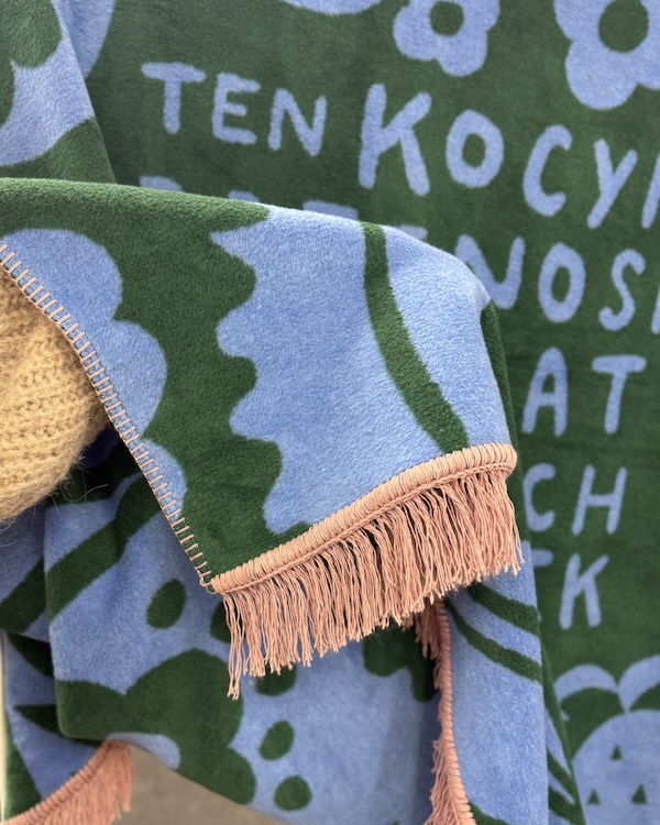 Dwustronny koc z napisem: Ten kocyk przenosi w świat słodkich drzemek.