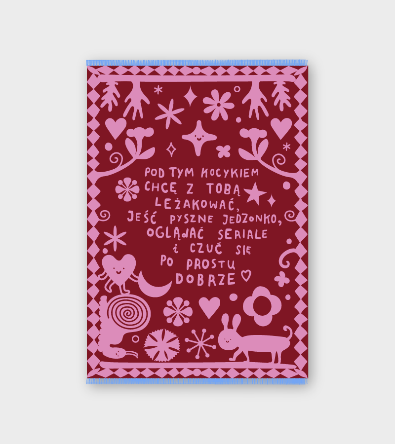 Dwustronny koc z napisem: Pod tym kocykiem chcę z Tobą leżakować, jeść pyszne jedzonko, oglądać seriale i czuć się po prostu dobrze.