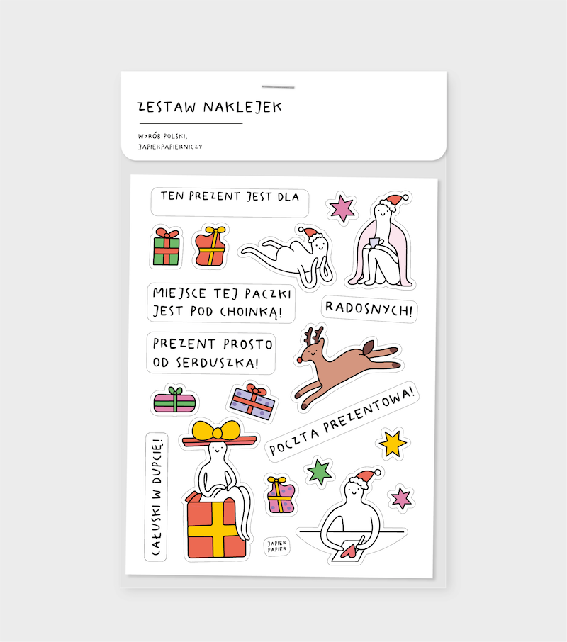 Jeśli chcesz, żeby Twoje paczki pod choinką wyglądały jakby pakował je sam mikołajowy Elf, to jest ten moment, żeby wrzucić do koszyka nasz zestaw naklejek! W środku znajdziesz całą zgraję świątecznych cudaków: prezenciki, gwiazdki i teksty, które mówią wszystko za Ciebie: od „Ten prezent jest dla…” po absolutne klasyki „Całuski w dupcie!”.